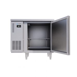 Điểm đặc trưng và lợi thế cạnh tranh lớn nhất của ICR-1S097 chính là thiết kế dạng bàn tích hợp. Với chiều dài 900mm và đặc biệt là chiều sâu 750mm (sâu hơn so với các mẫu tiêu chuẩn 600mm), cùng bề mặt bằng inox cao cấp, tủ không chỉ đóng vai trò là một kho làm mát mà còn là một bề mặt làm việc rộng rãi và thoải mái hơn, lý tưởng để sơ chế, cắt thái, và chuẩn bị nguyên liệu ngay tại chỗ. Điều này đặc biệt có ý nghĩa trong các không gian bếp có diện tích hạn chế nhưng vẫn cần một bề mặt làm việc đủ lớn, giúp tối ưu hóa quy trình làm việc và giảm thiểu di chuyển. Thiết kế một cánh cửa duy nhất tối giản nhưng vẫn đảm bảo dễ dàng tiếp cận khoang chứa.