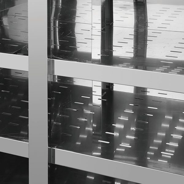 Sản phẩm có kích thước W1000 x D550 x H1275mm, dung tích lớn với khả năng chứa lên đến 100 khay thực phẩm cùng lúc. Thiết kế dạng tủ hai cánh mở, thuận tiện cho thao tác lấy – cất khay, giúp tiết kiệm thời gian và đảm bảo quy trình làm việc trơn tru trong môi trường bếp bận rộn.