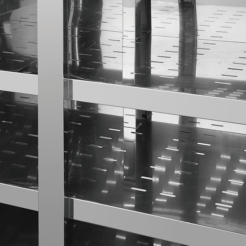 Toàn bộ thân tủ được làm từ thép không gỉ 201 và thép 430 cao cấp, chống ăn mòn, chịu nhiệt tốt, đảm bảo độ bền lâu dài và an toàn khi sử dụng. Cửa tủ sử dụng kính cường lực trong suốt, cho phép quan sát bên trong dễ dàng mà không cần mở cửa, đồng thời đảm bảo an toàn khi vận hành.
